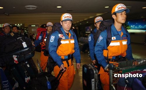 5月21日上午,前往四川地震灾区支援中国抗震救灾的日本国际紧急救援队一行乘机回到东京,受到日本政府和在日华人华侨的欢迎。图为抵达成田机场的日本救援队队员。