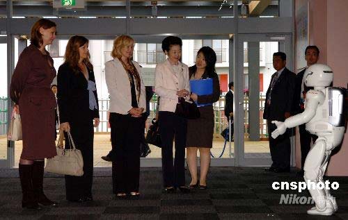 7月8日下午,在洞爷湖出席八国集团峰会的部分国家元首夫人,在日本第一夫人贵代子的陪同下参观峰会环保型的国际新闻中心。日本公司研制的机器人asimo在门口迎接诸位夫人的到来,并用流利的英语和夫人们进行交流,令首脑夫人们惊喜不已。中新社发 朱沿华 摄