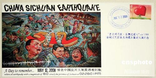 当地时间7月12日,美国洛杉矶华人华侨,为纪念中国四川省汶川县发生8级地震,悼念地震遇难同胞,举办了“星光明月夜,乐舞送爱心”洛城文艺团体支持震后从建纪念活动,并发行首日封一枚。图为首日封设计者魏进发。中新社发 金立冬 摄