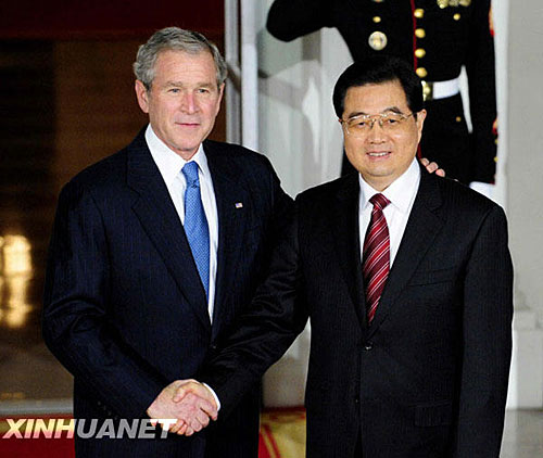 11月14日,美国总统布什在白宫为出席二十国集团领导人金融市场和世界经济峰会的领导人举行招待晚宴。这是晚宴前,美国总统布什在白宫迎接中国国家主席胡锦涛。新华社记者 张岩摄