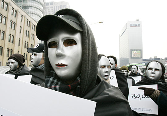 1月16日,韩国一些民众头带面具聚集在首尔以色列使馆前进行示威,抗议以色列袭击加沙。