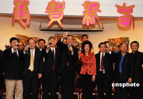 当地时间1月16日晚,中国驻美大使周文重(前排中)和夫人谢淑敏女士(前右四)在华盛顿中国城,向来自海峡两岸的大华府十八个最大侨社领袖以及大华府地区及广大旅美侨胞祝贺牛年新春。图为周大使夫妇和侨社领袖们向广大侨胞敬酒贺新春。中新社发 邱江波 摄