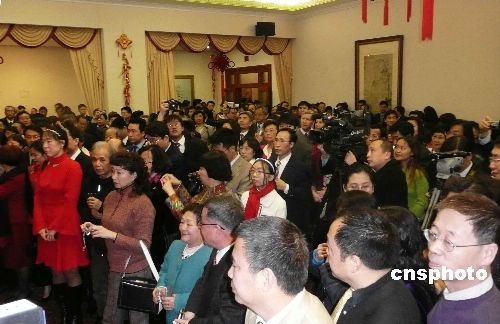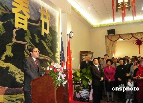 中国驻美大使周文重于当地时间17日晚在驻美使馆华侨华人春节招待会上致辞时表示,展望处于复杂而深刻变化的二00九年,中美都面临机遇和挑战,中方愿与美方一道推动中美关系稳步发展。当晚的招待会共有七百多名来自一百六十多个侨社的华侨华人出席。中新社发 覃展鹏 摄