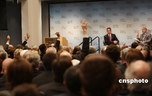 25日,美国财政部长盖特纳在位于纽约的美国外交关系协会(CFR)发表演讲时表示对美元很有信心,“美元的基础地位应该不会改变”。盖特纳同时表示,政府应该对金融公司有更大的控制权。图为盖特纳接受美国外交关系协会会员提问。中新社发 魏晞 摄