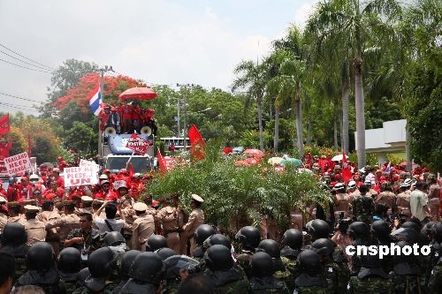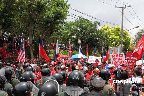 四月十日中午,两千多名泰国反独裁民主联盟“红衫军”聚集在帕塔亚东亚领导人系列会议中心门口进行示威抗议活动,泰国警方派出大批人员维持秩序。中新社发 顾时宏 摄