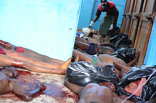 在肯尼亚中部城镇卡拉蒂纳4月20日夜间,当地平民与一非法组织间发生暴力流血冲突事件,导致24人死亡、3人重伤。事件中死者多为非法组织的成员。图为医院工作人员在太平间整理暴力冲突事件中死亡者的尸体。