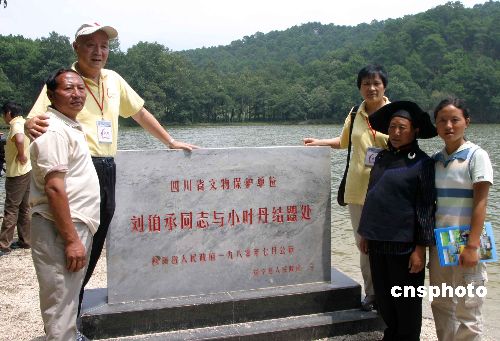 8月12日,当年彝海结盟的后代、刘伯承元帅之子刘太行将军和夫人,在结盟地彝海边与小叶丹孙女曲比姆(右二)一家合影。当日,开国元勋子女重走长征路抵达红军长征途中彝海结盟之地凉山冕宁县彝海寻踪。1935年5月20日至27日,红军长征经过冕宁,先遣队司令员刘伯承与彝族果基家支首领果基约达(小叶丹)在彝海之滨歃血结盟,红军顺利通过百里彝区。从此“彝海结盟”成为民族团结的历史佳话。中新社发 田地 摄