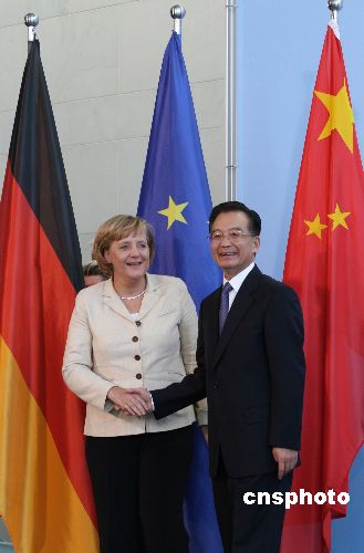9月14日中午,在结束会谈之后,中国总理温家宝和德国总理默克尔共同举行了新闻发布会,并回答了中德两国记者的提问.图为两国总理在结束新闻发布会后握手告别。中新社发 钟诚 摄