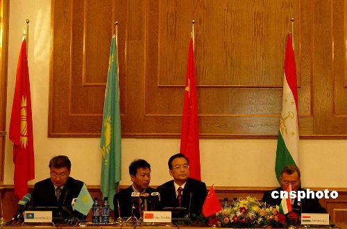 9月15日,中国国务院总理温家宝出席了在塔吉克斯坦首都杜尚别举行的上海合作组织成员国总理第五次会议,会后与其他五国总理一起出席了记者会。 中新社发 孙宇挺 摄