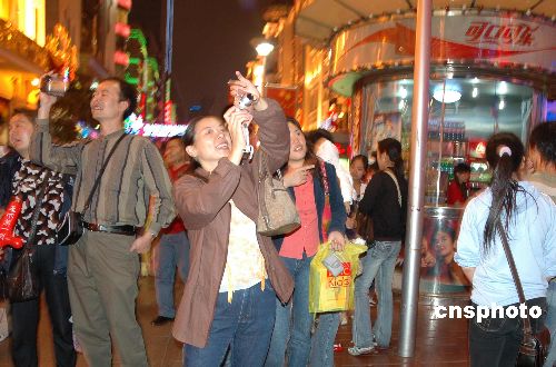 图为“十一”夜晚上海马路上灯如白昼。上海市容环卫局关于今年国庆期间申城中心城区开放所有夜景灯光的方案,在2006年10月1日晚得到璀璨的印证。外滩“幸福之光”大型灯光表演,首次采用缩短关闭和启动的间隔,一改半小时亮灯一次的模式,供市民与游客尽情欣赏。中心城区的临时性彩灯,楼宇灯光,户外广告灯光,商业橱窗灯光在“十一”之夜尽情开放,申城成为真正的不夜城。中新社发 蒋振雄 摄