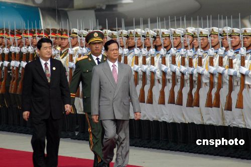 10月30日上午,越南总理阮晋勇抵达南宁吴圩国际机场,阮晋勇将参加下午在南宁开幕的中国—东盟建立对话关系十五周年纪念峰会。图为阮晋勇在南宁国际机场检阅中国人民解放军三军仪仗队。中新社发 夏晓弘 摄