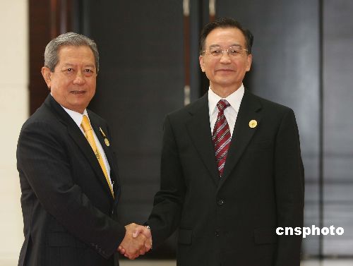 十月三十日,中国—东盟建立对话关系十五周年纪念峰会在广西南宁荔园山庄国际会议中心开幕。图为中国国务院总理温家宝欢迎泰国总理素拉育。中新社发 廖文静 摄