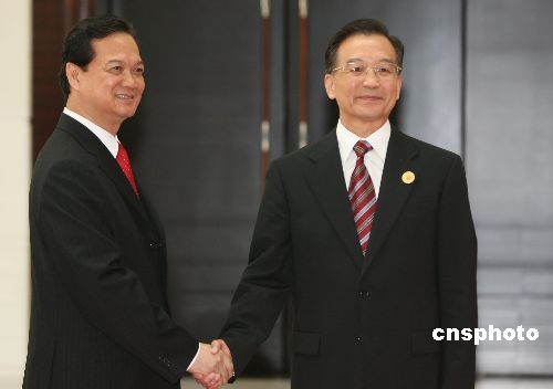 十月三十日,中国—东盟建立对话关系十五周年纪念峰会在广西南宁荔园山庄国际会议中心开幕。图为中国国务院总理温家宝欢迎越南总理阮晋勇与会。中新社发 廖文静 摄