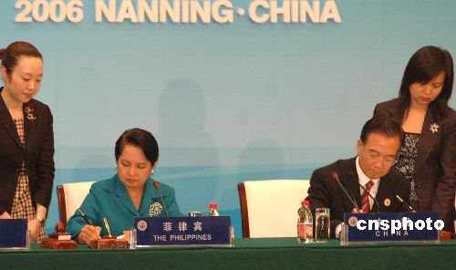 十月三十日下午,中国—东盟建立对话关系十五周年纪念峰会在中国广西南宁市开幕。会后,中国与东盟十国领导人在会后共同签署联合声明。图为中国国务院总理温家宝和菲律宾总统阿罗约在签署联合声明。中新社发 蒋雪林 摄