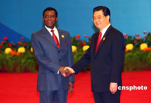 11月4日,中非合作论坛北京峰会在北京人民大会堂开幕。中国国家主席胡锦涛在大会开幕前迎接赤道几内亚总统奥比昂。中新社发 盛佳鹏 摄