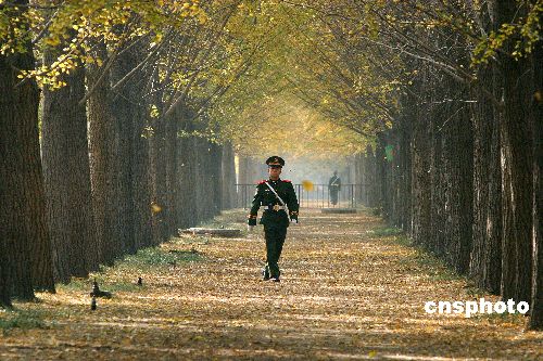 11月4日,一些赶到北京钓鱼台国宾馆东侧林荫道拍摄银杏的人们发现,为保证会议代表驻地安全,这里目前不允许行人进入。中非合作论坛北京峰会期间,北京加强了安全保卫工作,其中投入公安、武警力量30来万、社会力量50多万。当天上午,中非合作论坛北京峰会在北京人民大会堂开幕。中新社发 鲁谷 摄