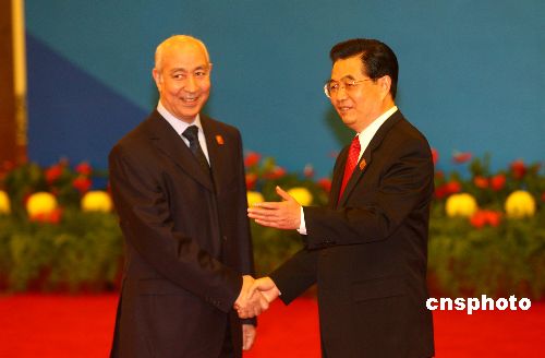 11月4日,中非合作论坛北京峰会在北京人民大会堂开幕。中国国家主席胡锦涛在大会开幕前迎接摩洛哥首相杰图。中新社发 盛佳鹏 摄