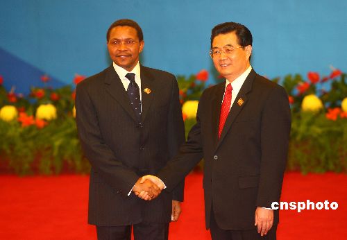 11月4日,中非合作论坛北京峰会在北京人民大会堂开幕。中国国家主席胡锦涛在大会开幕前迎接坦桑尼亚总统基奎特。中新社发 盛佳鹏 摄