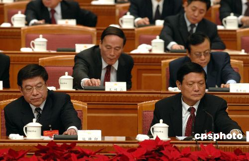 北京市十二届人大五次会议一月三十一日闭幕,大会表决通过了政府工作报告、高级人民法院报告等六项决议,图为刘淇(前排右)、杜德印(前排左)、王岐山(中)等按下表决器。中新社发 张宇 摄