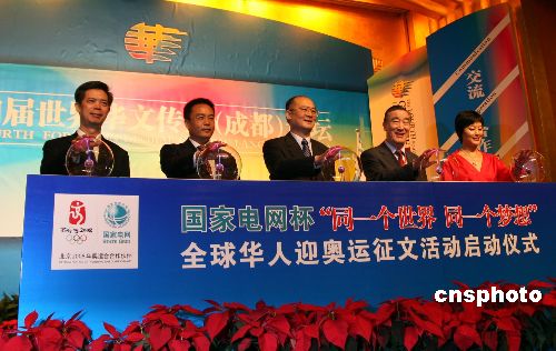 9月4日,国家电网杯“全球华人迎奥运”征文活动在四川成都正式启动。图为国务院侨务办公室副主任赵阳(中)、中国奥委会副主席屠铭德(右二)、国家电网公司副总经理曹志安(左二)、中新社社长郭招金(左一)、国际奥委会驻中国首席代表李红共同启动国家电网杯征文活动。中新社发 郭晋嘉 摄