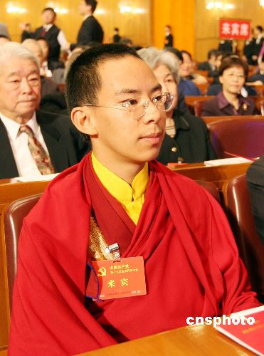 十月十五日,中国共产党第十七次全国代表大会在北京人民大会堂开幕,十一世班禅额尔德尼·确吉杰布受邀列席会议。中新社发 毛建军 摄