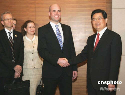 4月12日下午,海南省博鳌,中国国家主席胡锦涛会见来华访问并出席博鳌亚洲论坛2008年年会开幕式的瑞典首相弗雷德里克·赖因费尔特以及随行人员。中新社发 任晨鸣 摄