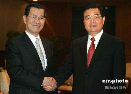 4月12日下午,中共中央总书记胡锦涛在海南省博鳌会见出席博鳌亚洲论坛2008年会的两岸共同市场基金会董事长萧万长。中新社发 任晨鸣 摄