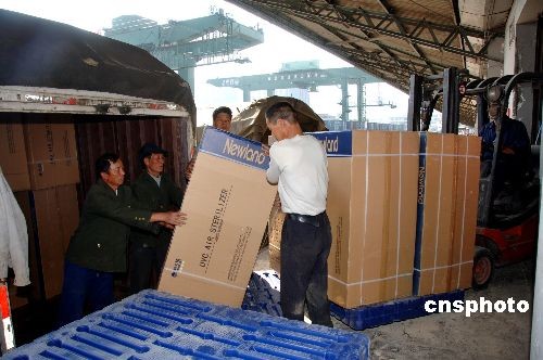 五月二十一日,福州市民政局工作人员在福州铁路货运东站装运发送灾区急需的紫外线空气清新机。经过跟踪汶川地震救灾工作需求,福州向社会各界发布捐助信息,至二十日十六时收到各界人士捐献的紫外线空气清新机、小型轮式消毒车、接骨板、婴儿奶粉、衣被等急需物品价值约一千三百万元人民币。