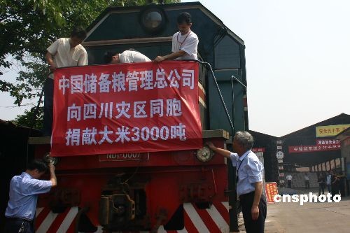 5月21日,中储粮总公司湖南分公司正在长沙装运捐赠给四川地震灾区的大米。为支援灾区,中储粮总公司安排湖南、湖北和四川直属企业紧急加工大米3000吨送往灾区,其中湖南分公司负责加工捐赠2040吨。