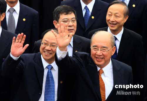 5月27日,中国国民党主席吴伯雄率领的大陆访问团拜谒中山陵。应中共中央总书记胡锦涛的邀请,吴伯雄率团对大陆进行为期6天的访问,首站便是南京。他在拜谒仪式后特别强调,两岸要正视历史,面对现实,开创未来,明年国民党将派团参加在南京举行的孙中山先生奉安中山陵80周年大型纪念活动。图为吴伯雄(右)向周围民众挥手致意。中新社发 盛佳鹏 摄