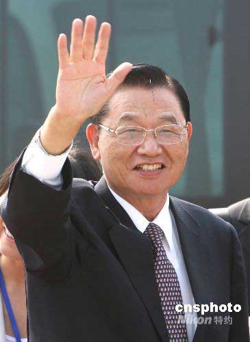 十一日下午三时十五分许,台湾海峡交流基金会董事长江丙坤率海基会代表团抵达北京首都机场,向在场的中外媒体挥手致意。中新社发 赵振清 摄