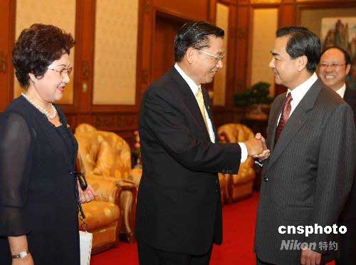 6月12日晚,新任中台办、国台办主任王毅在北京钓鱼台会见并宴请台湾海峡交流基金会董事长江丙坤一行。中新社发 任晨鸣 摄