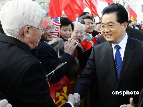 在出席此间举行的二十国集团金融峰会之后,中国国家主席胡锦涛今天上午来到中国驻美大使馆新馆视察,在大使馆外,胡锦涛主席与在这里迎候的当地华侨华人代表亲切握手,问寒问暖。图为胡锦涛与当地华侨紧紧握手。中新社发 邱江波 摄