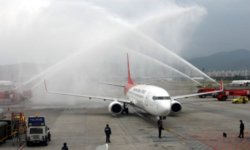 2008年12月15日,深圳航空首航台湾的第一班平日包机在台北松山机场降落。松山机场方面以喷水方式表示欢迎。两岸常态包机直航从此开始营运。(“中央社”图)