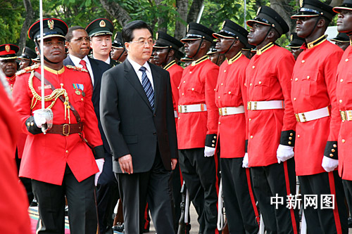 当地时间十四日上午,坦桑尼亚总统基奎特举行隆重仪式,热烈欢迎中国国家主席胡锦涛对坦桑尼亚进行国事访问。中新社记者 齐彬摄