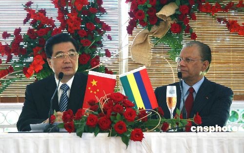 当地时间2月17日上午,正在毛里求斯访问的中国国家主席胡锦涛,与毛里求斯总理拉姆古兰举行会谈。图为会谈后,胡锦涛与拉姆古兰共同会见记者。中新社发 齐彬 摄