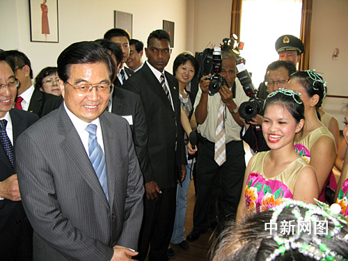 正在毛里求斯访问的中国国家主席胡锦涛,当地时间十七日下午来到毛里求斯中国文化中心参观。图为他与舞蹈班学员亲切交谈,鼓励她们学好中国舞蹈。中新社记者 齐彬摄