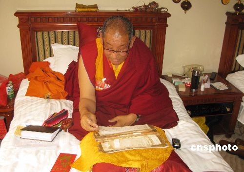 3月2日下午,赴北京出席全国“两会”的政协委员、西藏林芝地区拉鲁寺活佛洛桑·旦白尼玛在所住宾馆房间研读会议材料。中新社发 张子扬 摄