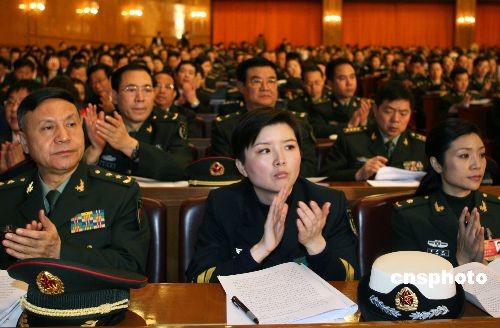 3月5日上午,十一届全国人大二次会议在北京人民大会堂开幕,全国人大解放军代表团的代表认真听取国务院总理温家宝所作《政府工作报告》。中新社发 任晨鸣 摄