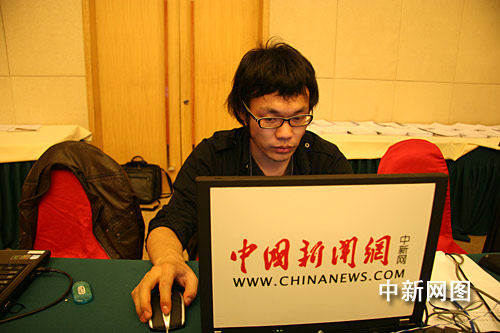 3月6日下午,出席十一届全国人大二次会议的5位企业家代表在大会新闻中心(梅地亚中心多功能厅)就“企业如何应对国际金融危机的挑战”接受中外记者的采访。图为本网记者在现场进行直播。中新网记者 唐伟杰 摄