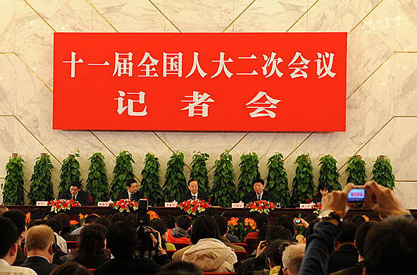 3月10日,十一届全国人大二次会议举行记者会,工业和信息化部部长李毅中、人力资源和社会保障部部长尹蔚民、商务部部长陈德铭答记者问。陈树根 摄