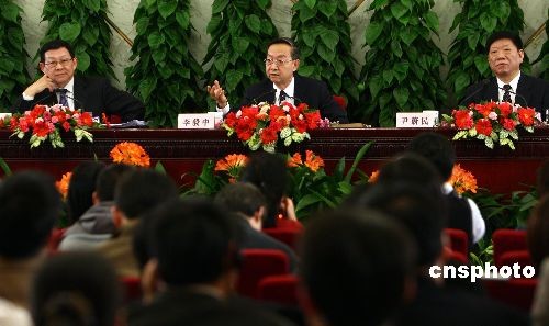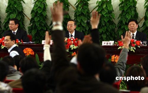 3月10日,十一届全国人大二次会议在人民大会堂举行记者会,工业和信息化部部长李毅中(中)、人力资源和社会保障部部长尹蔚民(右)、商务部部长陈德铭(左)就“扩内需、促就业、保增长”答记者问。中新社发 杜洋 摄