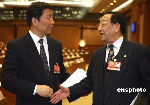 3月12日上午,十一届全国人大二次会议第三次主席团会议在北京人民大会堂举行。会议经过表决,决定将关于全国人大常委会工作报告的决议草案、关于最高人民法院工作报告的决议草案、关于最高人民检察院工作报告的决议草案提请各代表团审议。主席团成员李源潮(左)、列确(西藏自治区人大常委会主任)出席。中新社发 任晨鸣 摄