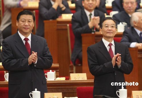 3月12日,全国政协十一届二次会议举行闭幕大会。国务院总理温家宝与国家副主席习近平出席闭幕大会。中新社发 盛佳鹏 摄