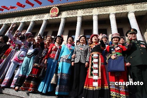 3月13日,第十一届全国人民代表大会第二次会议在人民大会堂闭幕,代表们在人民大会堂前留影。中新社发 杜洋 摄