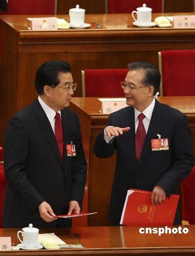 3月13日,第十一届全国人民代表大会第二次会议在北京人民大会堂举行闭幕会,国家主席胡锦涛在会议闭幕后与国务院总理温家宝交谈。中新社发 盛佳鹏 摄