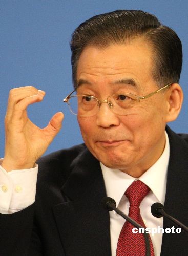 3月13日上午,温家宝总理在中外记者招待会上回答中国新闻社记者、中国新闻网记者翁阳提问时表示,财政赤字还在可控的范围内,债务也还是安全的。中新社发 任晨鸣 摄