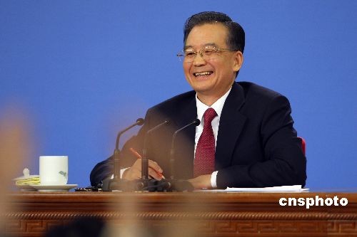 3月13日,十一届全国人大第二次会议在北京闭幕后,中国国务院总理温家宝应大会发言人的邀请,在人民大会堂与采访大会的中外记者见面并回答记者提出的问题。图为温家宝笑答最后一个提问。中新社发 盛佳鹏 摄