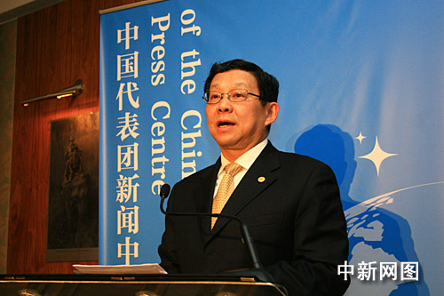 当地时间4月2日晚,中国商务部长陈德铭在G20伦敦峰会中国代表团新闻中心接受采访,呼吁警惕贸易保护主义抬头。李鹏 摄