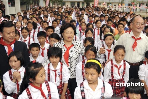 五月十二日,四川省眉州市尚义中心学校侨爱工程教学楼落成仪式隆重举行,灾区学子们为国务院侨办主任李海峰(中)、国务院侨办副主任赵阳和世茂集团董事局主席许荣茂等献唱“感恩的心”。该教学楼由知名侨商许荣茂捐建。中新社发 廖攀 摄